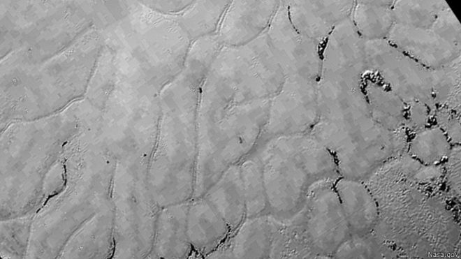 Зонд НАСА "Нью Хорайзонс", который недавно пролетел мимо Плутона, транслировал новые фотографии поверхности планеты, сделанные в высоком разрешении. На снимках хорошо видна ледяная равнина региона "Спутник", неофициально названного в честь первого искусственного спутника Земли, сообщает BBC.
