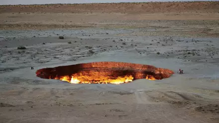 Газовый кратер Дарваза находится в 90 километрах от аула Ербент в Дашогузском велаяте Туркменистана. Местные жители и путешественники называют его "Дверью в преисподнюю", или "Вратами ада". Диаметр кратера составляет приблизительно 60 метров, глубина - около 20 метров. Появился в 1971 году в результате раскопок и бурения геологами разведочной скважины. С тех пор природный газ, выходящий из кратера, непрерывно горит днем и ночью.