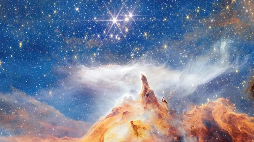 То, что на фото кажется скалистой вершиной горы, освещенной звездами и окутанной перистыми облаками, на самом деле представляет собой космический пылевой ландшафт, разъедаемый обжигающими ветрами и излучением соседних массивных молодых звезд.