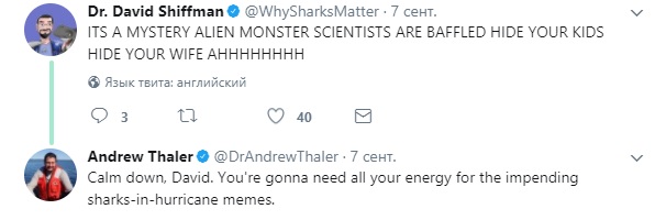 В комментариях тут же принялись шутить про панику среди населения и мемы про акул и ураганы.