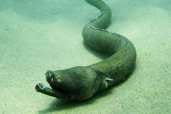 Как оказалось, обнаруженная на пляже рыба - это саблезубый угорь, Aplatophis chauliodus. Он обитает обычно на глубинах от 60 до 90 метров и питается другими рыбами и донными животными. Вот как животное выглядит живьем.