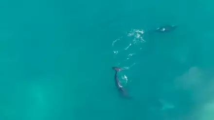Беспилотник запечатлел, как группа косаток разделилась: пара из них проследовала на восток в сторону устья местной реки - известного места активности акул.