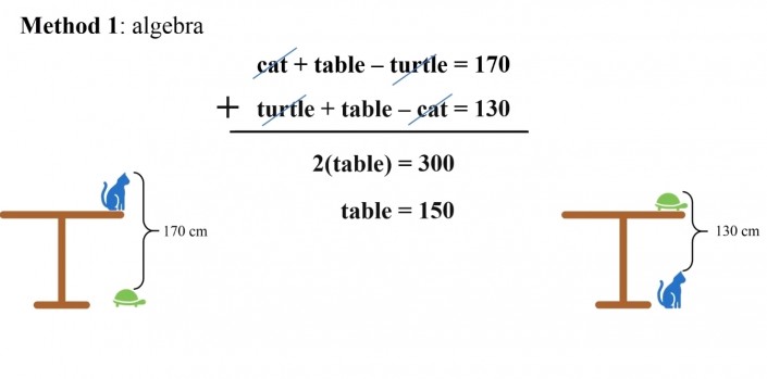 Второй - мысленно наложить оба стола друг на друга и опять же "сократить" животных. Таким образом, мы получаем высоту стола, это 150 сантиметров.