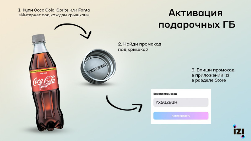 Цифровой оператор izi и Coca-Cola дарят бесплатные гигабайты Цифровой мобильный оператор izi предоставляет бесплатный интернет вместе с освежающим вкусом Coca-Cola. Теперь каждая бутылочка вашего любимого