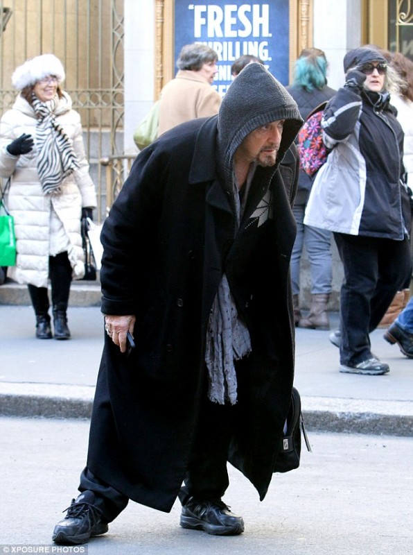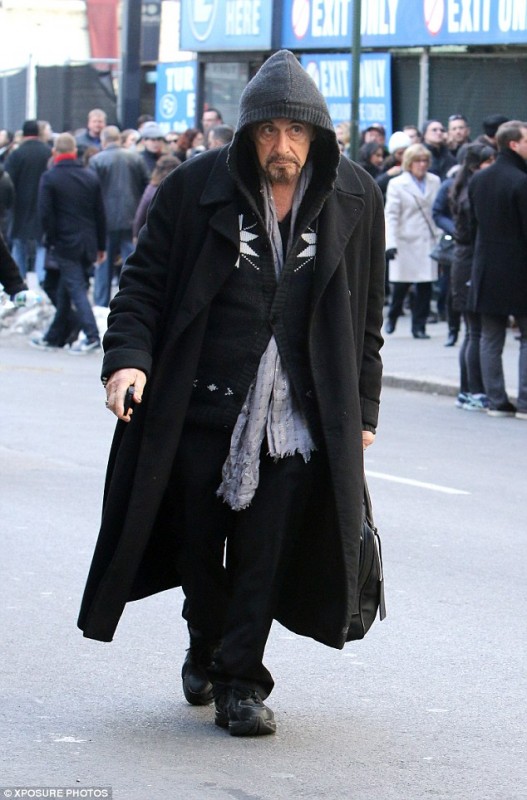 Из-за мешковатой одежды с капюшоном прохожие не признали в мужчине мировую звезду. "Он выглядел, как бомж, - пишет в блоге один из "очевидцев". - Мы с друзьями сначала не поняли, что это Аль Пачино. Вел себя он крайне странно, выбегал на оживленную дорогу, что-то говорил как сумасшедший".