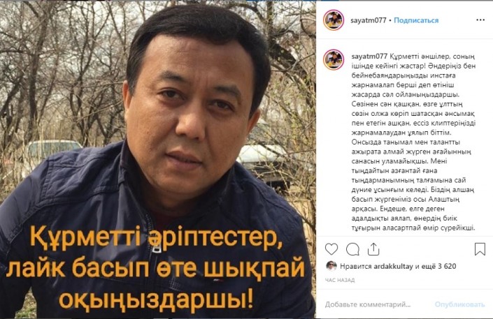 "Құрметті әншілер, соның ішінде кейінгі жастар! Әндеріңіз бен бейнебаяндарыңызды инстаға жарнамалап берші деп өтініш жасарда сәл ойланыңыздаршы. Сөзінен сән қашқан, өзге ұлттың сөзін олжа көріп шатасқан әнсымақ пен етегін ашқан, ессіз клиптеріңізді жарнамалаудан ұялып біттім. Онсызда танымал мен талантты ажырата алмай жүрген ағайынның санасын уламайықшы. Мені тыңдайтын азғантай ғана тыңдарманымның талғамына сай дүние ұсынғым келеді. Біздің алшаң басып жүргеніміз осы Алаштың арқасы. Ендеше, елге деген адалдықты аялап, өнердің биік тұғырын аласартпай өмір сүрейікші. Құрметті әріптестер түсінесіздер деп ойлаймын", - деп жазды Саят Медеуов Instagram желісіндегі парақшасында.