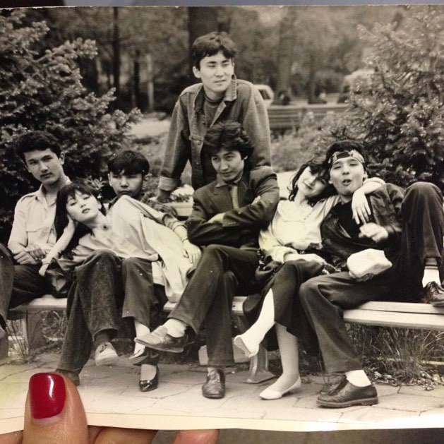 На другом снимке Баян Максаткызы и Мадина Балгабаева (ныне телеведущая новостей на телеканале КТК) в студенческие годы. Комментируя фото, Балгабаева уточнила, что "с булкой xлеба на фото изображен Темиржан Жанботаев" (сейчас актер, режиссер).