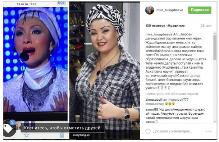 "Ал....тюрбан дегендi,етегi бар киiммен кию керек, Жадо! Джинсымен емес, клетка койлекке мынау ала орамал сайкес келмейдi! Мозги иногда надо все таки вкл! Понимаю, с 10 классным образованием, далеко не уедешь, итак тебе нечего делать, поступай к нам в академию Жургенова... Там Камилла Асхатовна научит, привьет эстетический вкус! Семipiп, алiндi бiлмей, алек болганша-сауатынды аш!!! Никогда не поздно! Век живи - век учись!" - написала Тусупбаева на своей странице в Instagram (орфография и пунктуация сохранены).