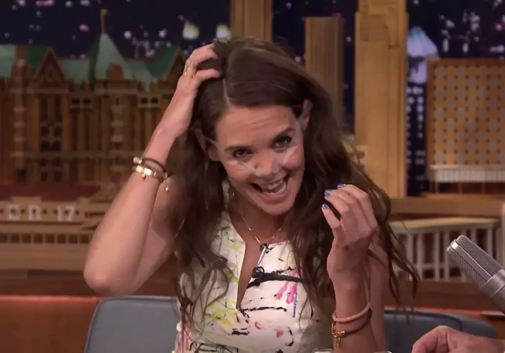 Комик Джимми Фэллон предложил Кэти Холмс сыграть в игру "Скажи что-нибудь". Участники должны по очереди говорить любые слова, главное - не останавливаться. Кто запнулся, тот проиграл. Проигравший, предупредил Фэллон, получит полоску скотча на лицо.
