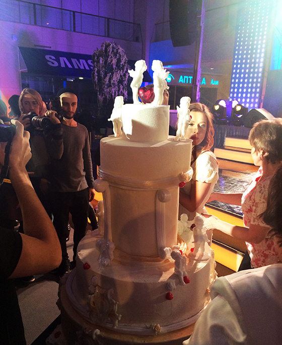 Кульминацией вечеринки стал вынос на сцену огромного трехъярусного торта, украшенного белоснежными ангелами. Под бурные аплодисменты Юлия и Александр разрезали угощение.