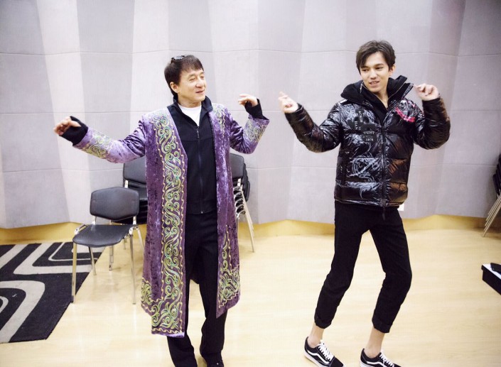 Джеки Чану чапан подарил казахстанский певец Димаш Кудайберген на их встрече в Китае.