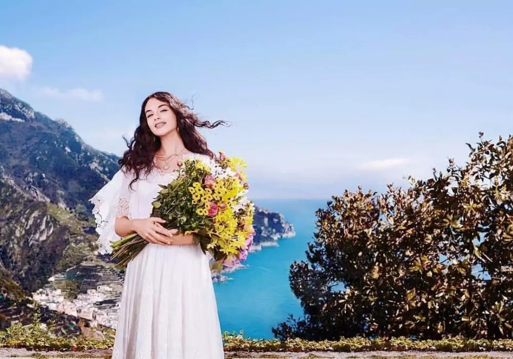 На фото Дева позирует в белоснежном кружевном платье на фоне Амальфийского побережья.