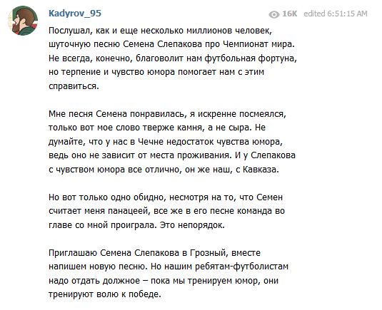 "Хочу обратиться ко всем, кто следил за моим недавним творчеством и кипишем вокруг него. Во-первых, спасибо за положительные отзывы. Во-вторых, за отрицательные отзывы тоже спасибо - каждый человек имеет право думать, как он думает. В-третьих, я не являюсь хейтером нашей сборной и всегда искренне болею за пацанов. Отсюда и такие эмоции. Было бы мне пофиг, эмоций бы не было и песни бы не было. Желаю им удачи и надеюсь, что выступят они достойно (хотел написать "верю", но "надеюсь" будет честнее). В-четвертых, спасибо Рамзану Ахматовичу за стихи и приглашение в Чечню. Думаю, эта поездка будет для меня интересным поэтическим опытом. Многие поэты приезжали за вдохновением на Кавказ. Некоторые после этого даже возвращались назад. Мне опасаться нечего - до Лермонтова мне еще далеко. Всем хорошего Чемпионата Мира и просто мира", - написал он.