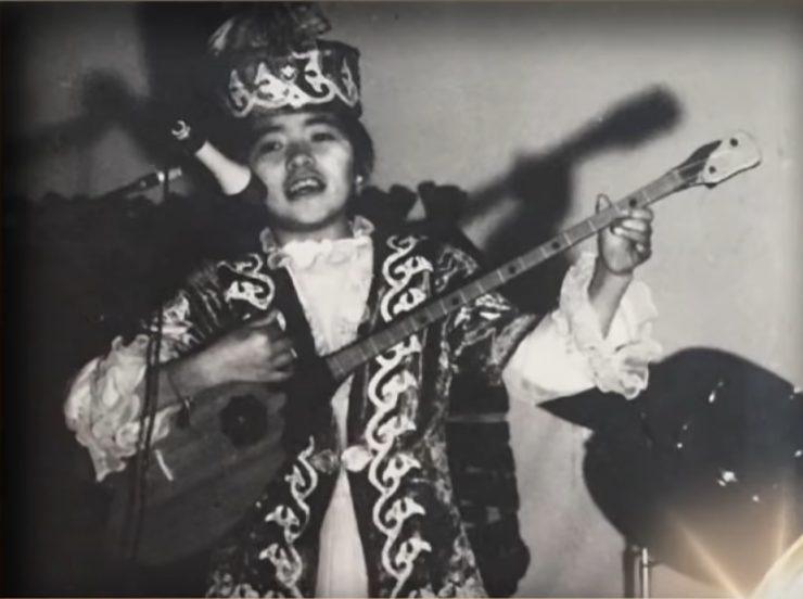 Суретте қос ішекті домбыраны шертіп, өнер көрсетіп отырған қыз әнші Гүлнұр Оразымбетова. Ол алғаш ән айтуды 5 жасында бастаған екен.