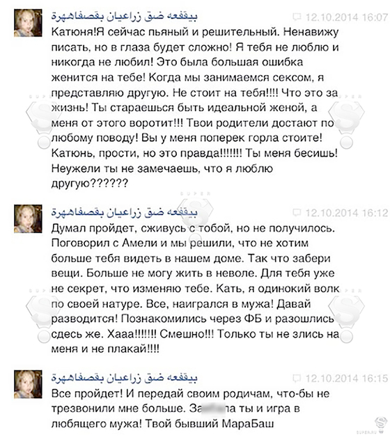 Судя по содержанию сообщений, пять месяцев супружеской жизни для Башарова были лишь "игрой в любящего мужа", а роскошная свадьба - "ошибкой". Кроме того, в своих сообщениях жене 40-летний актер признается, что любит другую женщину, и просит Екатерину оставить всякие попытки сохранить семью.