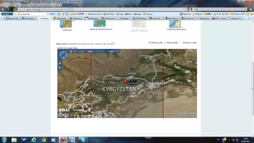 На территории Кыргызстана в 20.10 по времени Астаны произошло землетрясение магнитудой 3,2, передает корреспондент Tengrinews.kz со ссылкой на Европейско-Средиземноморский сейсмологический центр. Эпицентр подземных толков располагался на глубине шести километров в 110 километрах к югу от Алматы и в 34 километрах северо-западнее населенного пункта Кызыл-Туу (Кыргызстан). Информации о жертвах и разрушениях нет. С какой силой землетрясение ощущалось в Казахстане, пока не известно.