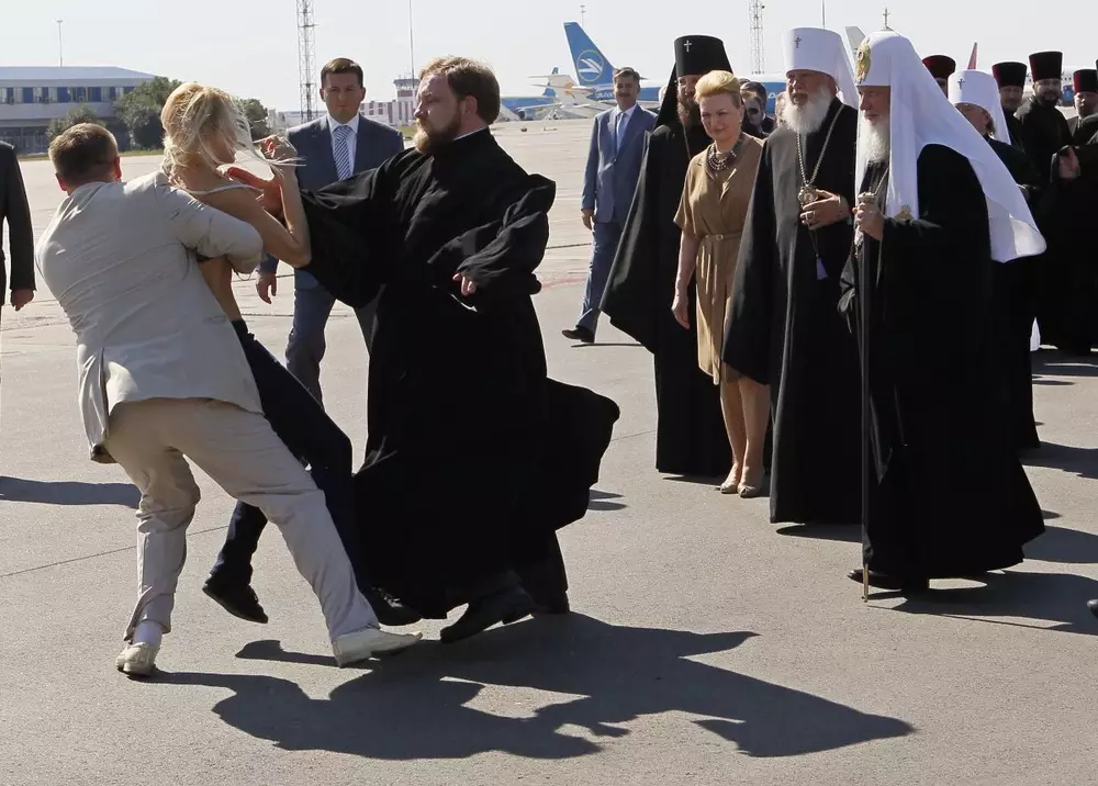 Активистка украинской феминистской организации FEMEN набросилась на главу Русской православной церкви патриарха Кирилла, прибывшего в аэропорт Киева, сообщает "Сегодня.ua".