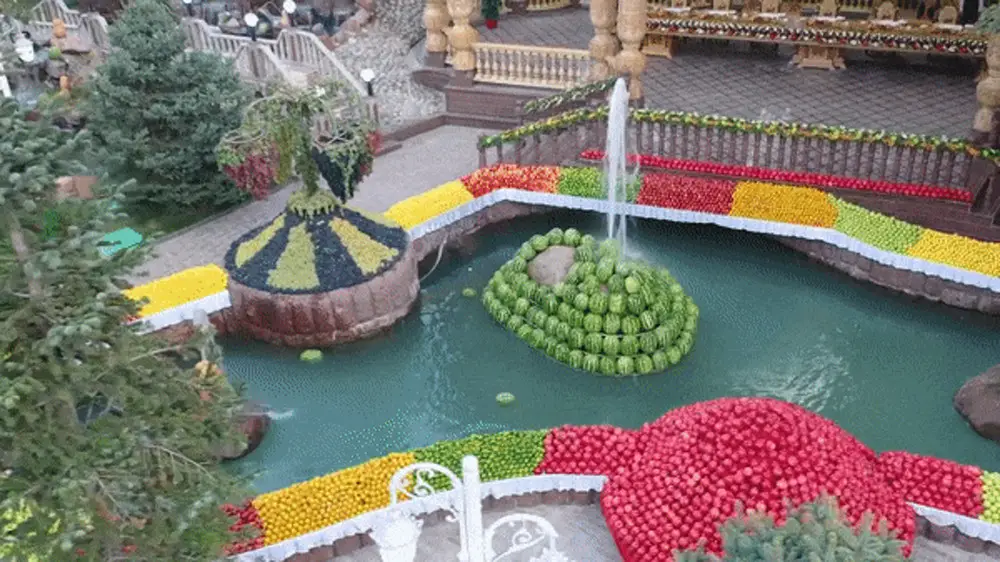 На кадрах, опубликованных пресс-службой, можно увидеть внушительные по своим размерам композиции из различных фруктов и ягод: фонтаны из арбузов, пирамиды из дынь и винограда, украшенный яблоками мост и многое другое.