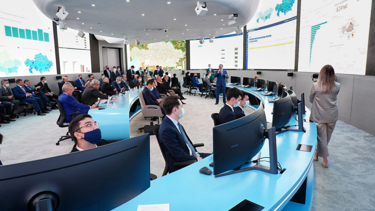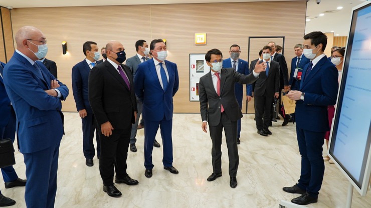 Премьер-министр Аскар Мамин и председатель правительства РФ Михаил Мишустин ознакомились с работой Цифрового офиса правительства Казахстана, реализуемыми проектами в сфере цифровизации государственных услуг населению и субъектам предпринимательства, а также деятельностью МФЦА.