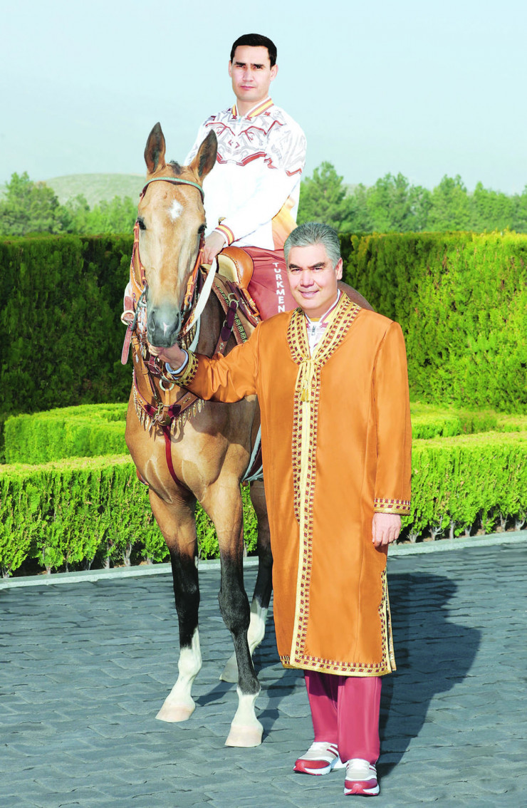 Затем президент Туркменистана оседлал скакуна по имени Ханбег, а Сердар Бердымухамедов - коня по имени Шаполат. Выведя коней на скаковую дорожку, они совершили верховую прогулку.
