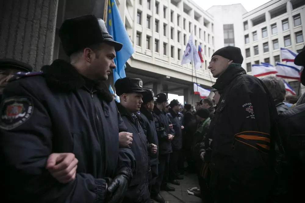 Противники новой власти заняли административные здания в Крыму Милиция у здания парламента Крыма в Симферополе во время противостояния крымских татар и пророссийских активистов (справа). ©REUTERS