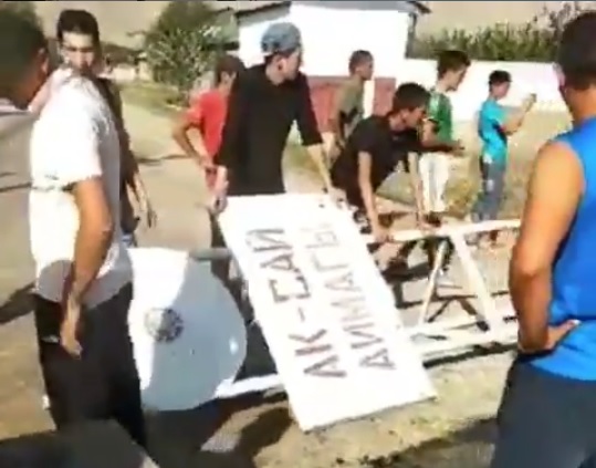 Тәжіктер "Ақ-Сай аймағы" жазуы бар белгіні алып тастап жатқан сәт. © Видео кадры
