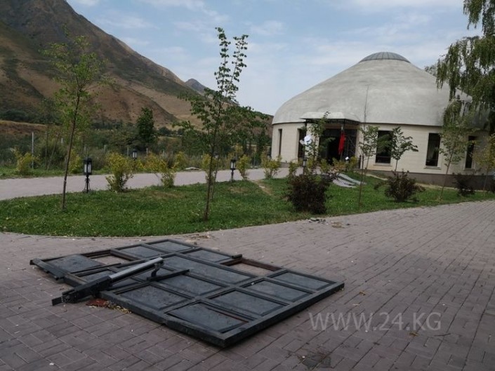 Сторонники Алмазбека Атамбаева сами наводят порядок. Они убирают камни и мусор вдоль дороги. В самом доме бывшего президента тоже тихо. Прямо у входа - сожженные маршрутки спецназа, искореженные ворота, въезд забаррикадирован деревянными столами.