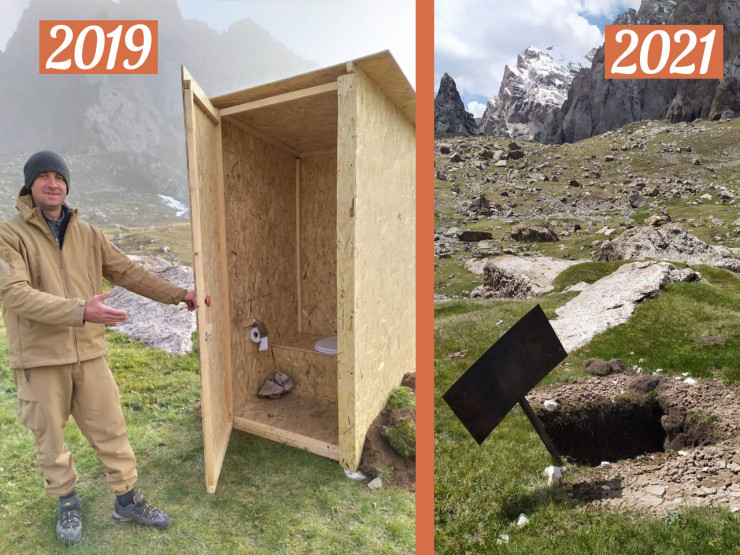 "В 2019 году мы решили подарить туалет по пути на озеро Кель-Суу. Постарались сделать добротные и удобные. В 2020-м туризма не было. А в 2021-м нас ожидало разочарование - туалет кто-то разобрал на части и разнес по своим нуждам. А потом удивляемся, почему туалеты по всей стране не ставят? Почему урн мусорных нет в горах? А выживут ли они?" - написал он у себя на странице в Facebook.