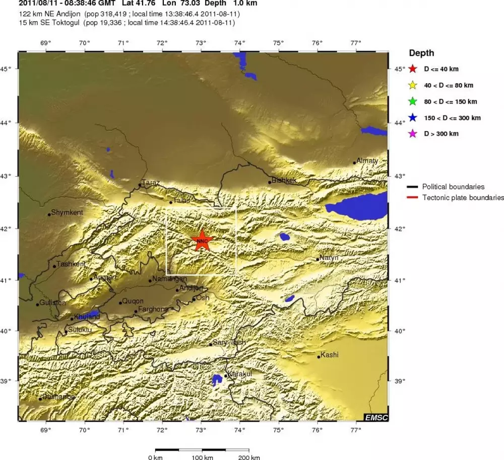 Подземные толчки были зафиксированы в 14.40. Эпицентр землетрясения находился на глубине одного километра в 122 километрах северо-восточнее города Андижан (Узбекистан) и в 15 километрах юго-восточнее города Токтогул в Кыргызстане.
