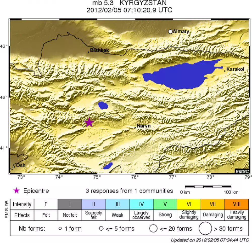 Подземные толчки были зафиксированы 5 февраля в 13.09. Эпицентр землетрясение находился в 155 километрах южнее Бишкека и в 89 километрах северо-западнее города Ат-Баши. Глубина подземных толчков составила 30 километров. Информации о жертвах и разрушениях нет.