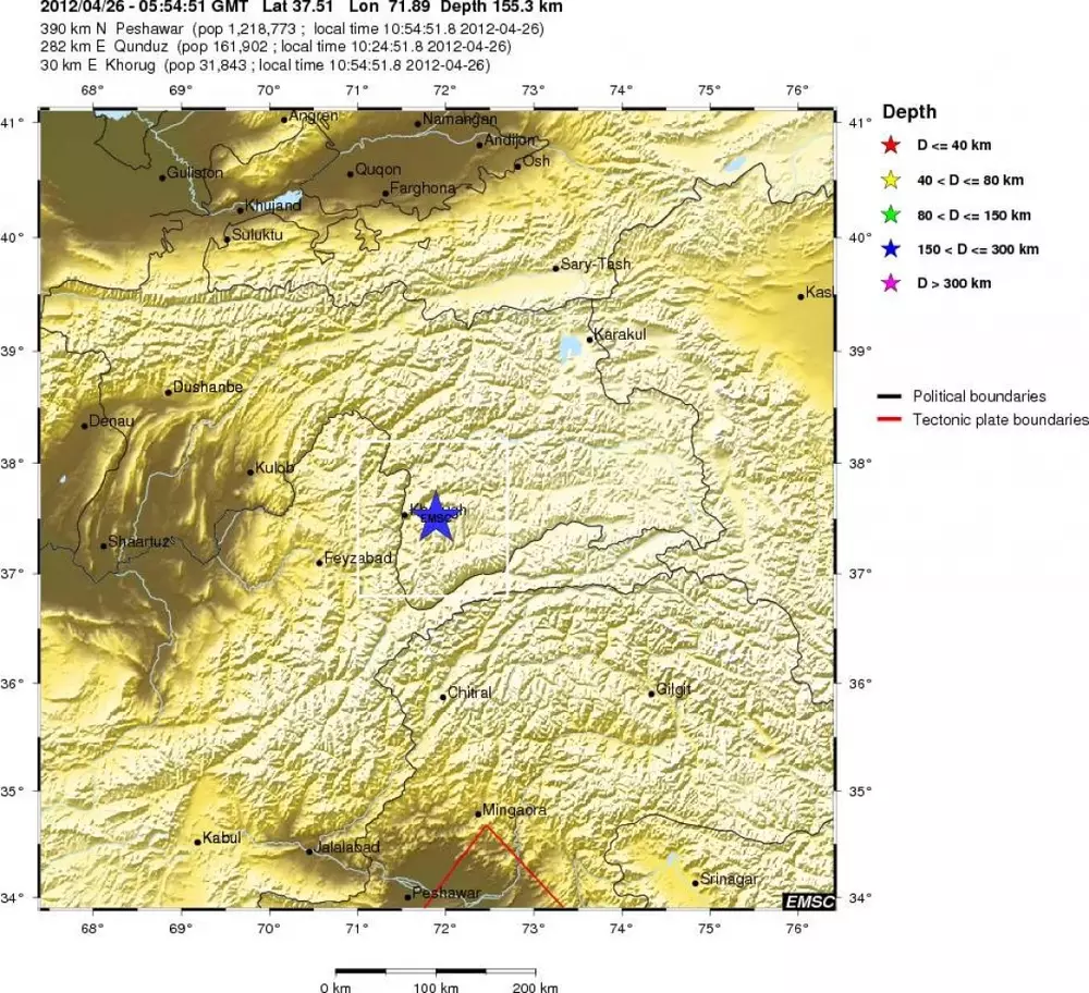 Однако по данным Европейско-Средиземноморского сейсмологического центра, магнитуда землетрясения составила 4,2. Эпицентр подземных толчков находился в 390 километрах севернее пакистанского города Пешавар и в 30 километрах от города Хорог (Таджикистан).