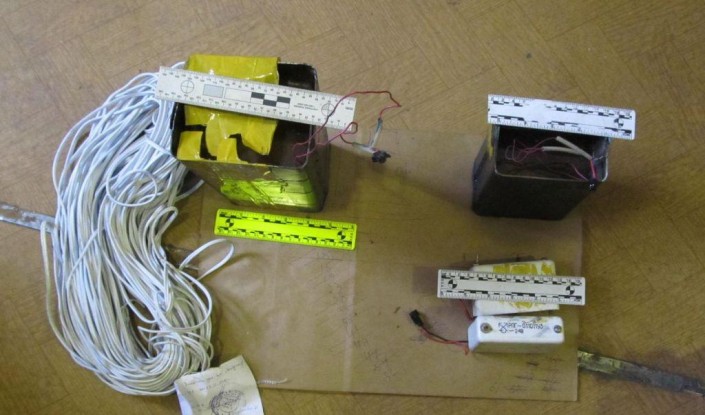 В ходе проведенного обыска у задержанного были обнаружены и изъяты компоненты самодельного взрывного устройства (аммиачная селитра, перекись водорода, поражающие элементы в виде шурупов и гвоздей), измельченный серный порошок, детонирующий шнур, бутылки с кислотой, мобильные телефоны, приспособленные в качестве пускового механизма, замыкатели электрической сети СВУ.
