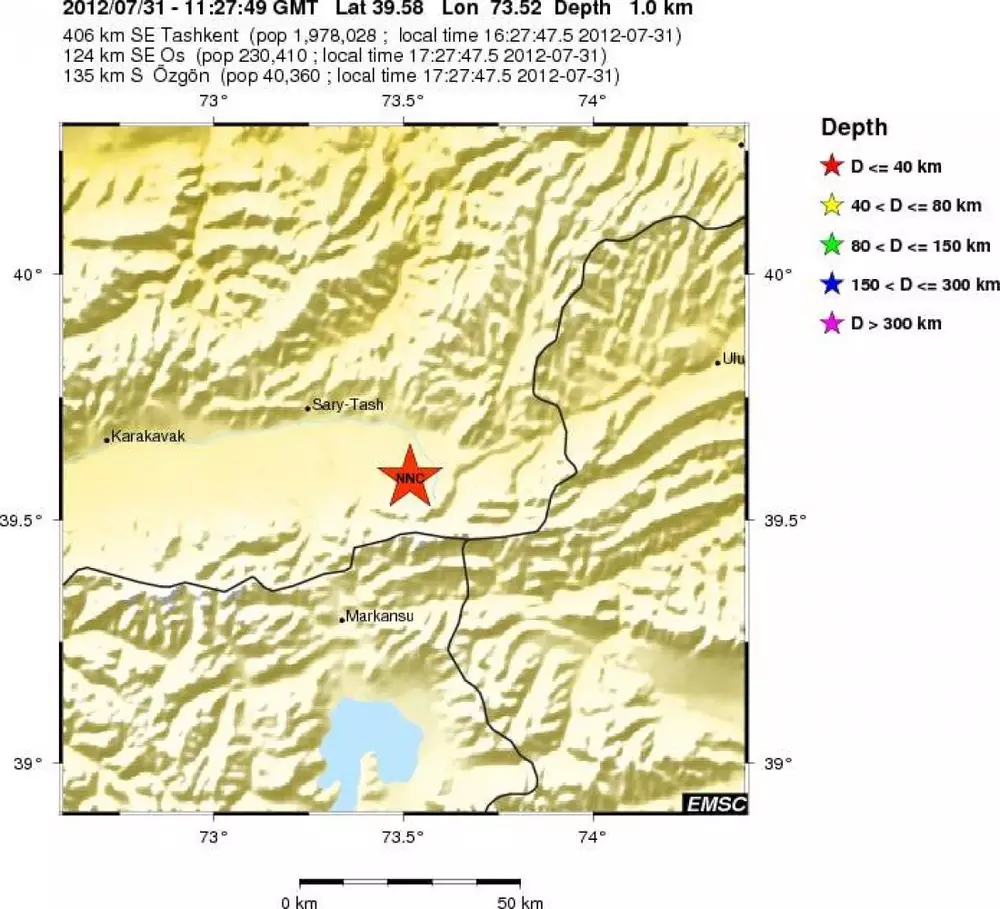 Напомним, в ночь на 26 июля в 57 километрах южнее города Кызыл-Кыя (Кыргызстан) произошло землетрясение магнитудой 4,5. Эпицентр также залегал на глубине одного километра.