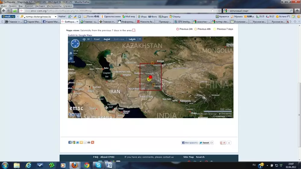 В Таджикистане произошло землетрясение магнитудой 4,7, передает корреспондент Tengrinews.kz со ссылкой на Европейско-Средиземноморский сейсмологический центр. Эпицентр подземных толчков зафиксирован на глубине 100 километров в 32 километрах восточнее города Хоруг (Таджикистан), в 282 километрах восточнее города Кундуз (Афганистан) и в 384 километрах севернее Пешавара (Пакистан). Информации о жертвах и разрушениях нет. В минувшую субботу в Таджикистане произошло землетрясение магнитудой 5,0. Эпицентр землетрясения находился в 300 километрах к юго-востоку от Душанбе вблизи таджикско-афганской границы.