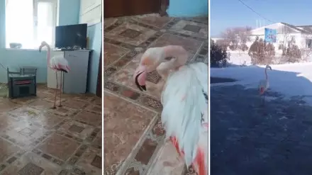 Замерзшего розового фламинго спасли в Мангистау Кадры из видео