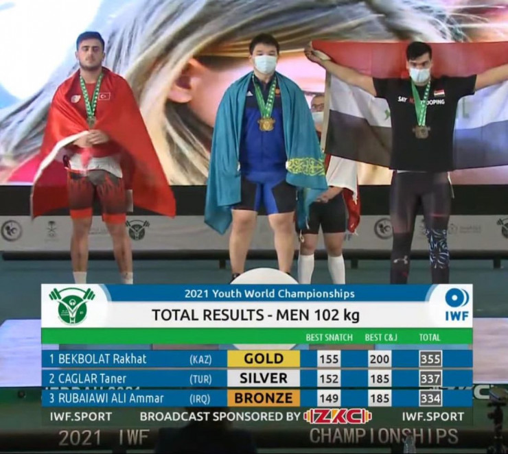 В сумме двоеборья Бекболат поднял 355 (155+200) килограммов. На втором месте расположился Танер Чаглар из Турции (152+185). Тройку лидеров замкнул спортсмен из Ирака Аммар Рубайави Али (149+185).