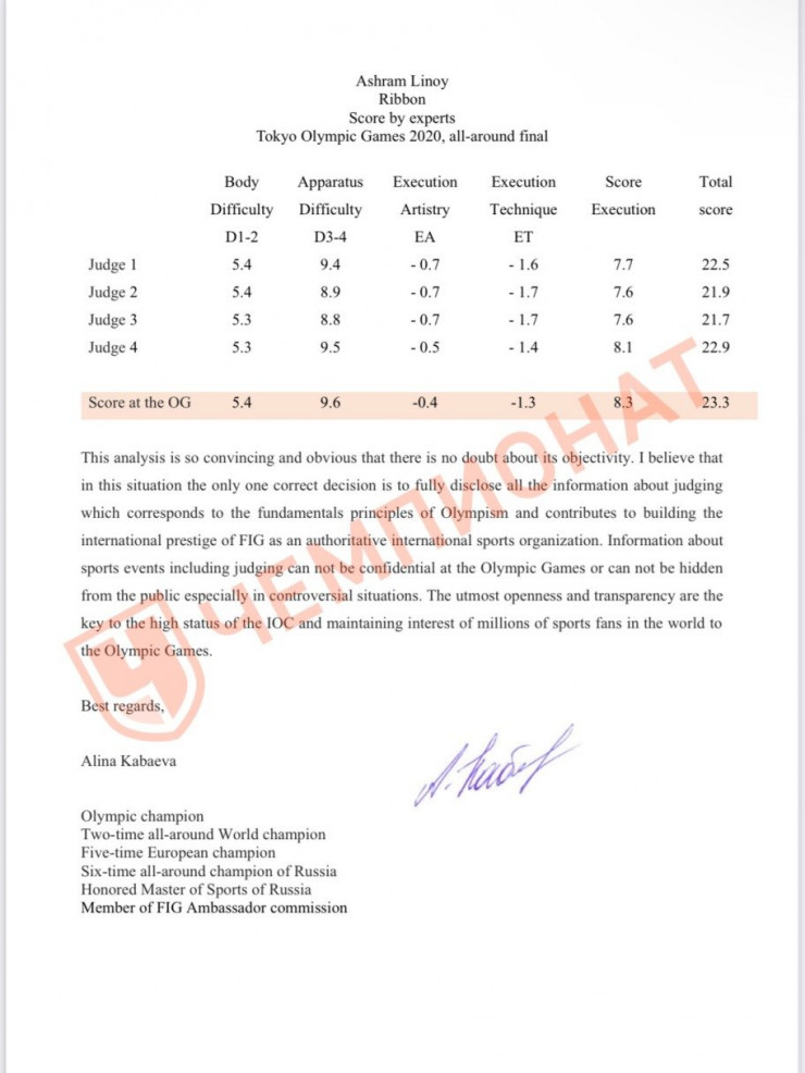 Анализируя оценки, проставленные российской гимнастке Дине Авериной и израильтянке Линой Ашрам, Кабаева констатирует, что судьи явно допустили ошибку, ведь средний балл у россиянки заметно выше, чем у ее израильской конкурентки, и составляет 24,000 балла против 23,300. Тем не менее жюри отдало олимпийское золото Ашрам.