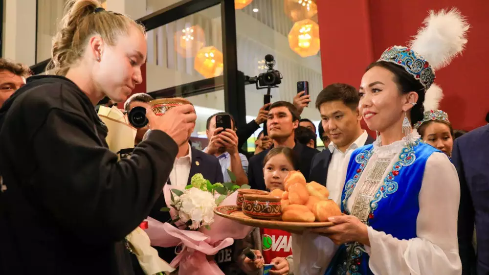 "Казахстан тобой гордится!" - такой плакат развернули встречающие фанаты. Теннисистка оставила несколько автографов юным болельщикам, а также попробовала национальные казахские угощения - кумыс и баурсаки.