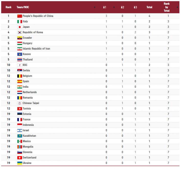 На второе место в турнирной таблице поднялась Италия. В копилке спортсменов одна золотая и серебряная медали. На третью строчку спустилась Япония.