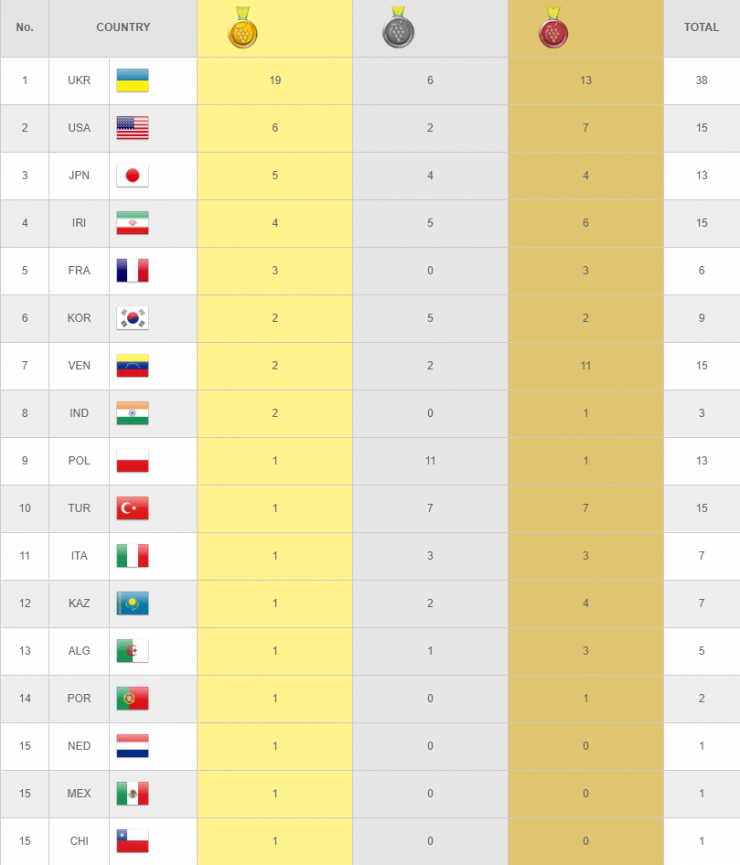Всего у Казахстана на данный момент семь медалей. Помимо золота, есть два серебра и четыре бронзы. В медальном зачете сборная Казахстана занимает 12-е место, а лидирует здесь Украина - 19-6-13.