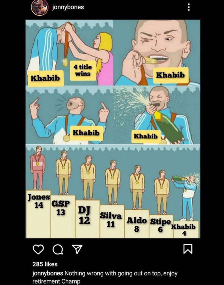 На нем изображен рисунок, на котором в ряд выстроены известные чемпионы UFC, среди которых и Хабиб. При этом подчеркивается, что его чествуют как лучшего среди всех, но в то же время он занимает низшую ступень на пьедестале почета и провел наименьшее количество титульных поединков.