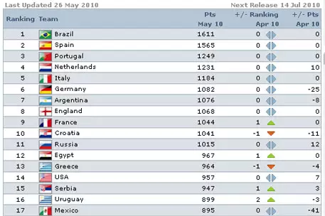 Единственным изменением в первой десятке последнего перед началом чемпионата мира в ЮАР рейтинга стало улучшение позиций сборной Франции, которой удалось обогнать Хорватию и занять девятое место. В активе подопечных Раймона Доменека 1044 очков, что на три меньше, чем у хорватской национальной команды. Сборная Казахстана, на счету которой 183 балла, сохранила за собой 129-е место лучших национальных команд рейтинга ФИФА.