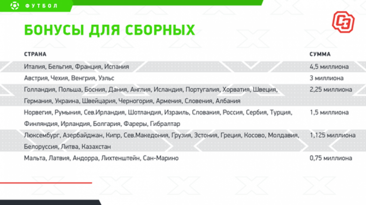 На сегодня, пока не сыгран "Финал четырех", 55 сборным полагаются следующие бонусы: