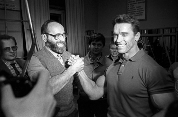 В период съемок американского фильма "Красная жара" актер и культурист Арнольд Шварценеггер встретился со своим кумиром Юрием Власовым. Московский спортивный клуб "Атлетика", февраль 1988. © РИА Новости