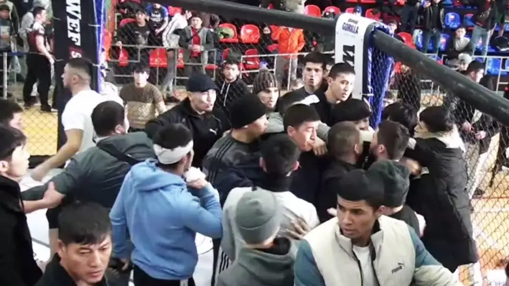 После такого неспортивного поведения в клетку забежали около 50 человек и напали на узбекского бойца, а после началась массовая драка.