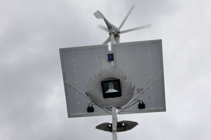 Нет, это не летающая тарелка. Это альтернативный источник энергии – электростанция, установленная на АО "ССГПО" в 2019 году. Она состоит из 1 солнечной панели, 1 ветрогенератора мощностью 190 ватт, 1 аккумуляторной батареи и инвертора для получения переменного тока. С помощью автоматики указанное оборудование осуществляет питание двух фонарей мощностью 4 ватт каждый.