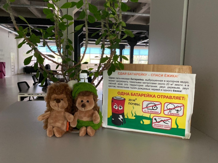 В защиту этих милых колючих существ сотрудники ТОО Business and technology services запустили конкурс среди своих подразделений: тот, кто больше сдает батареек в оргкомитет, тот в подарок получает "мягких" ежиков. Собранные батарейки направляются на утилизацию в специальные пункты. Этих ежиков зовут Карл и Клара. Теперь они красуются в офисе, напоминая сотрудникам о принципах зеленого образа жизни.