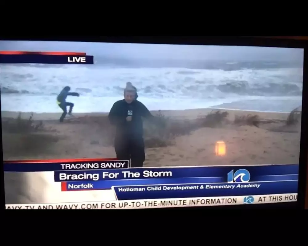 В этот же день трое юмористов попали в кадр выпуска новостей из города Атлантик-Сити (штат Нью-Джерси). Когда репортер, стоя в дождь и ветер посреди заполненной водой улицы, читал текст об эвакуации тысяч людей, раздетые по пояс мужчины в шортах весело танцевали за его спиной.