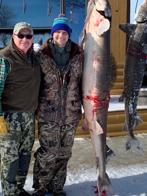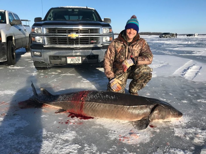 Огромного осетра поймали во время подледной рыбалки американец Джон Эйден и его отец в штате Висконсин, сообщает National Geographic.