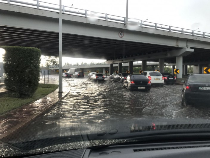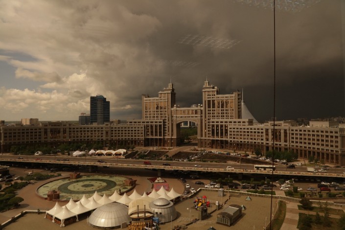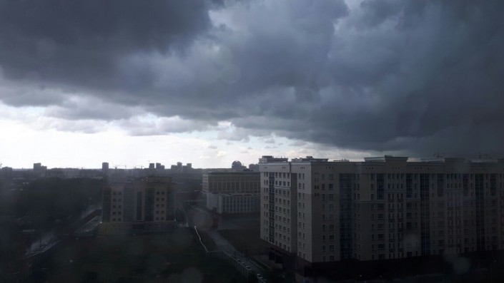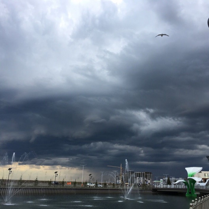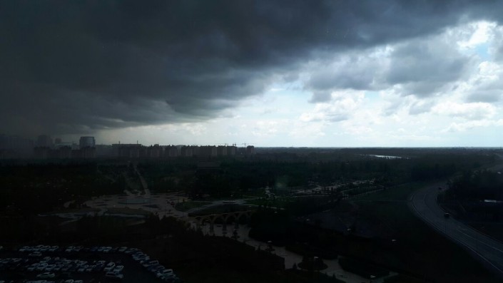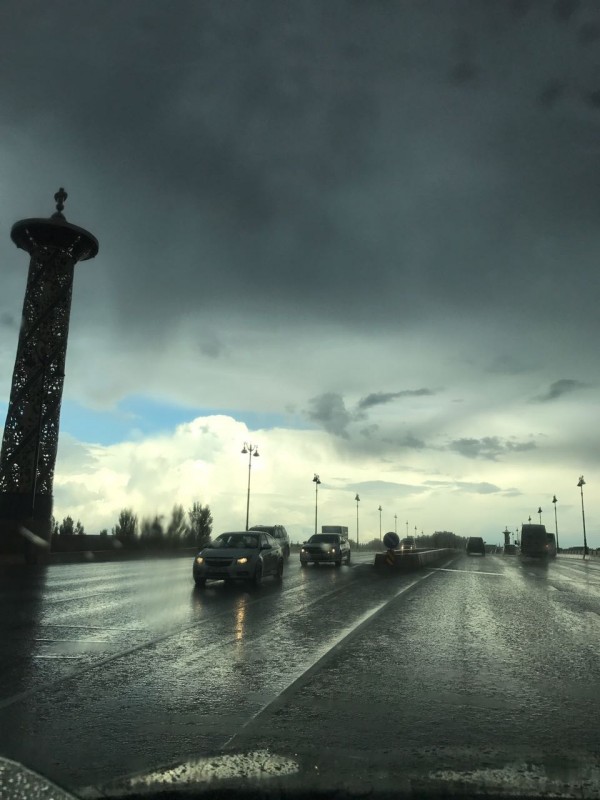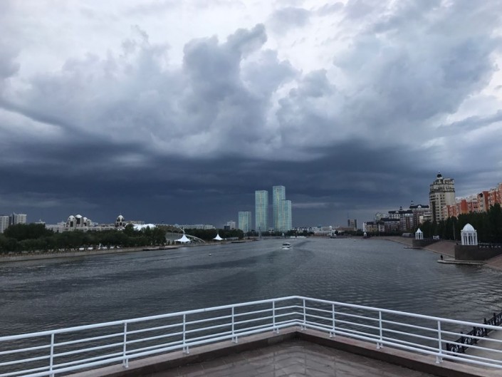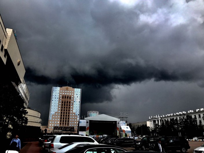 С утра в разных частях столицы можно было наблюдать разную погоду. Если на левобережье надвигались тучи и ожидался дождь, то на правом берегу Астаны была ясная и солнечная погода. Уже ближе к полудню центр столицы накрыли густые, черные тучи.